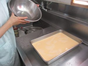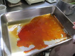 ①砂糖を焦がしてカラメルをつくる。バットに流す。